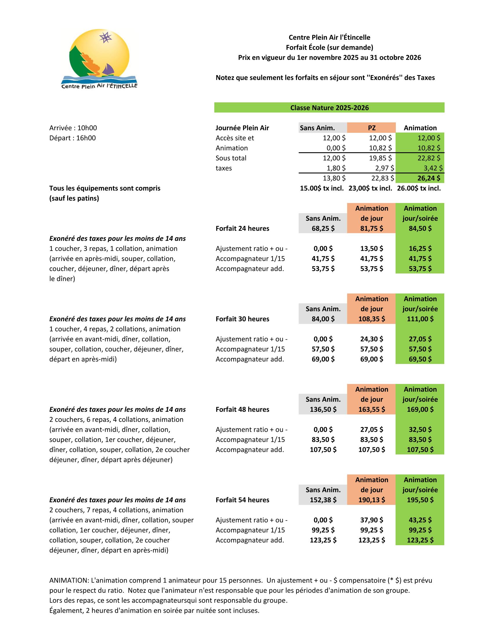 Tarifs - Classe nature